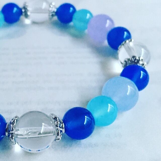 シーブルーカルセドニー、ブルーアゲート、クォーツァイト、クリスタルの爽やかな石の組み合わせです。