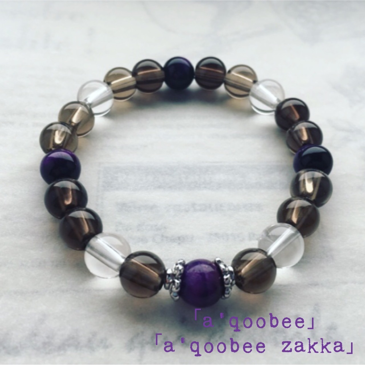 落ち着いたパープルタイガーアイとブラウンのスモーキークォーツ、クリスタルでまとめました。輝きの中にパワーを感じさせるブレスレットです。