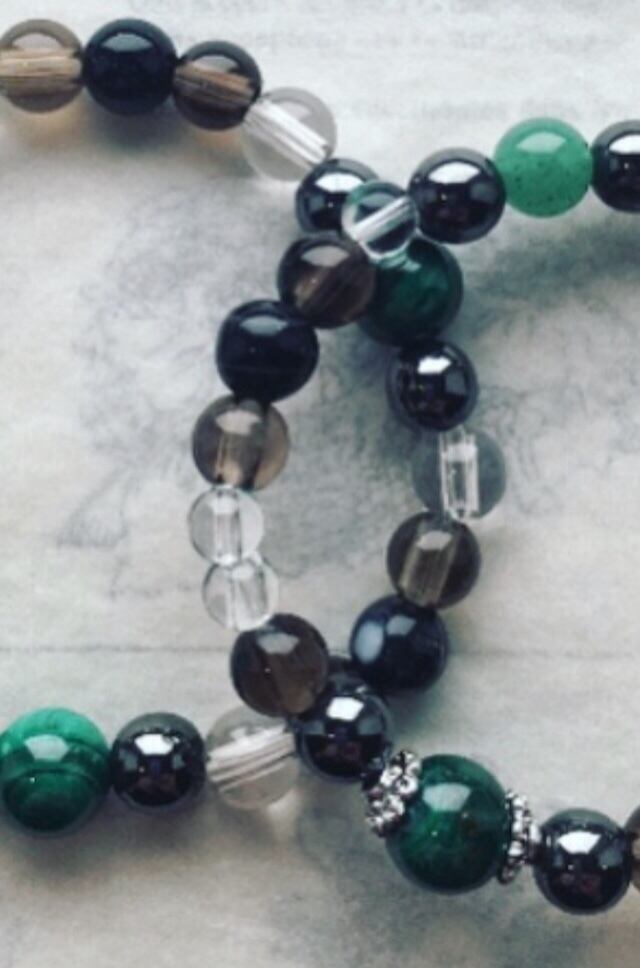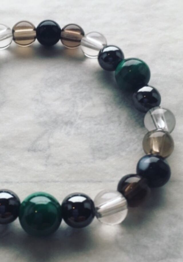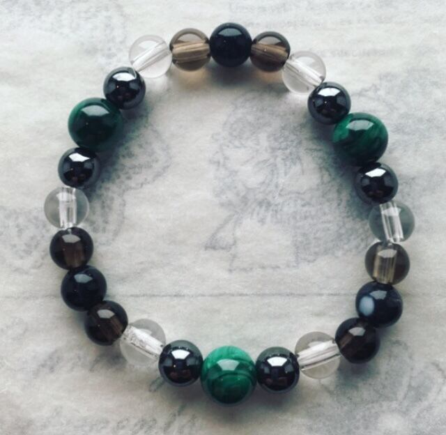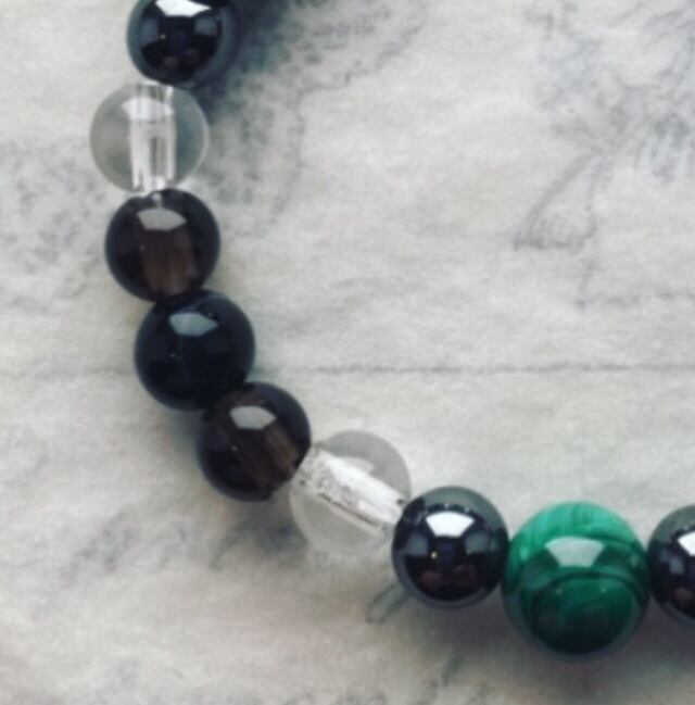 鮮やかなグリーンに孔雀の羽のような模様でエジプトでは古くから邪悪な霊から守るためにアイラインに使っていたマラカイト、落ち着いたブラウンのスモーキークォーツ、黒銀のヘマタイト、メノウの一種で眼のような模様の天眼石、クリスタルでまとめました。魔除け、厄除け、いじめを受けた時のお守りブレスレットです。